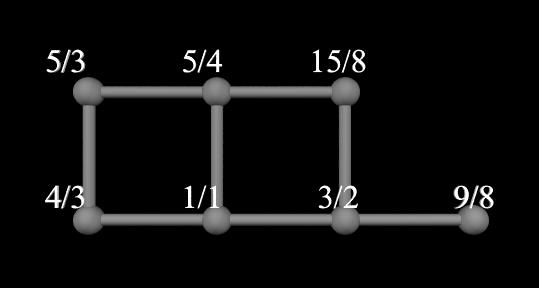 Lou Harrison's Jahla in the Form of a Ductia (or, to use its full title Jahla in the Form of a Ductia to Pleasure Leopold Stokowski on his Ninetieth Birthday) is a work originally for harp and percussion. This tuning is a standard diatonic just scale in D. (For the definition of cents and explanation of the following lattice diagram, see the note for the tuning of the Serenade and for more mathematical details, go here.).