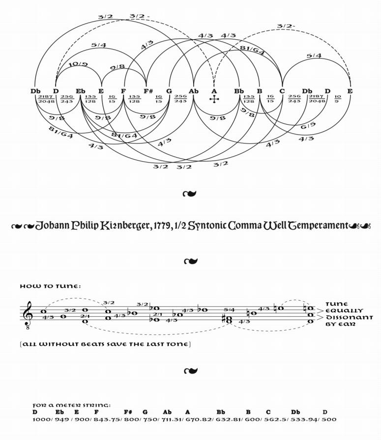Although Harrison appreciated the crystaline sonorities of just intonation, he understood that some musical intentions were best expressed with the use of temperament. (For the difference between just intonation and temperament, see my introduction here, as well as this page.) The second tuning published by Johann Kirnberger, an eighteenth-century composer and student of J. S. Bach's, offers an interesting middle ground: only one pitch in the tuning (the A) is tempered. Because all the dissonance of the "wolf" interval is borne only by a single compromised pitch, it probably was not widely used even in the eighteenth century. However, Harrison appreciated the fact that he could have both a large number of just intervals as well as what he called "gutsy fifths" when the tempered A is involved. Since his composition of his Piano Concerto (1985), which uses Kirnberger II tuning, he often kept his home piano (once owned by Henry Cowell) in this tuning. When choreographer Tandy Beal asked him for a piano piece, he wrote this one with a sensitive ear for how its harmonies would work in this tuning, using the "gutsy fifths" at key points of dissonance. Of course, when this piece is performed in equal temperament, this dimension of the work vanishes, so John Schneider replicated this tuning in his version for guitar. Here is Harrison's own diagram explaining the Kirnberger II temperament: